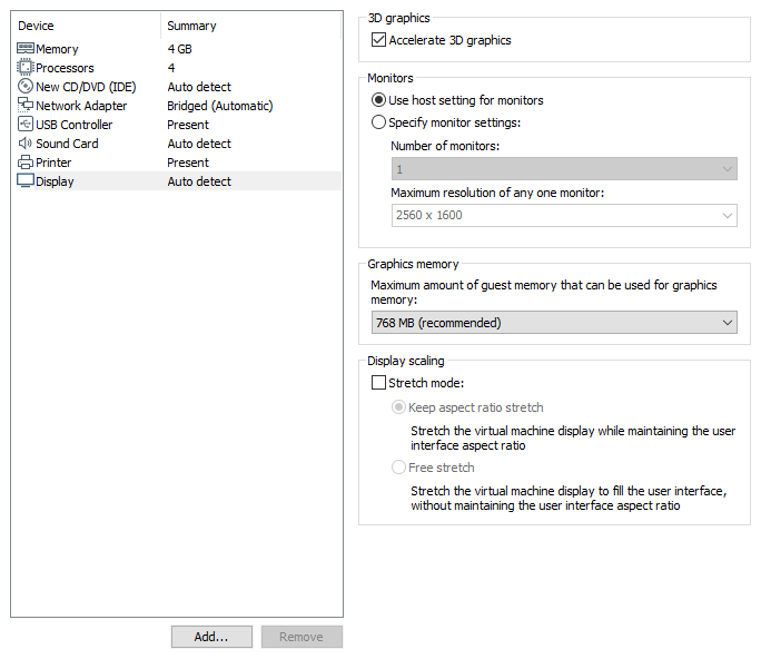 왼쪽의 Display 부분을 누르고 오른쪽의 Accelerate 3D graphics 항목을 체크해 주세요.