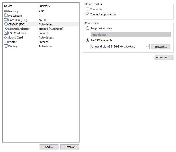 왼쪽의 CD/DVD 부분을 누르고 오른쪽에서 ISO 이미지 파일을 체크한 뒤,