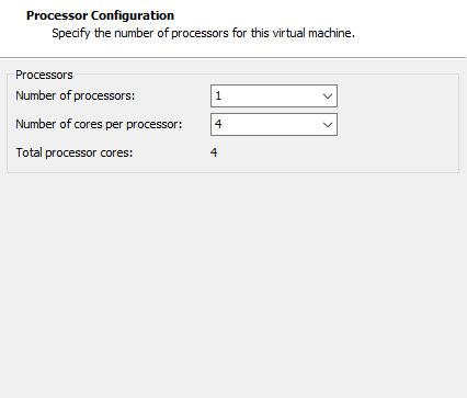 가상 운영체제의 CPU를 설정하는 부분으로 일반적인 환경에서 물리적인 프로세서는 1개이고