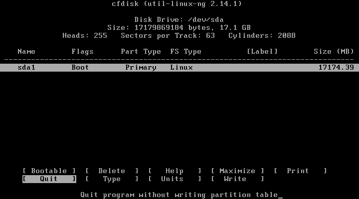 작업이 끝나면 Quit를 선택하고 엔터 키를 눌러 파티션 설정을 끝냅니다.
